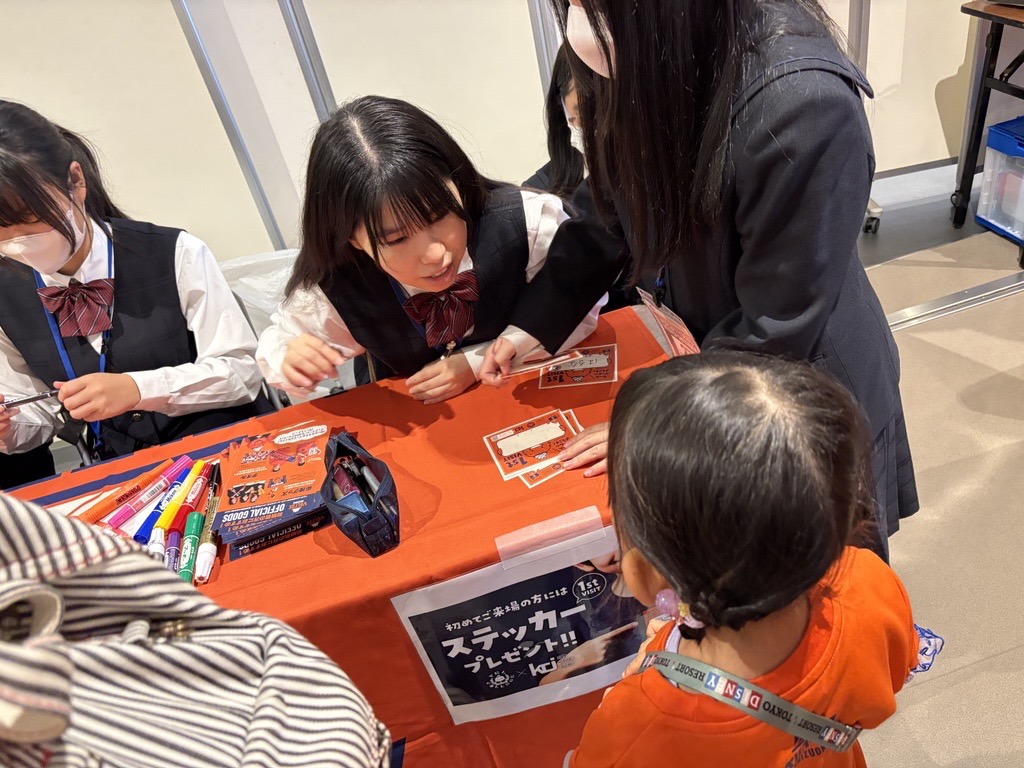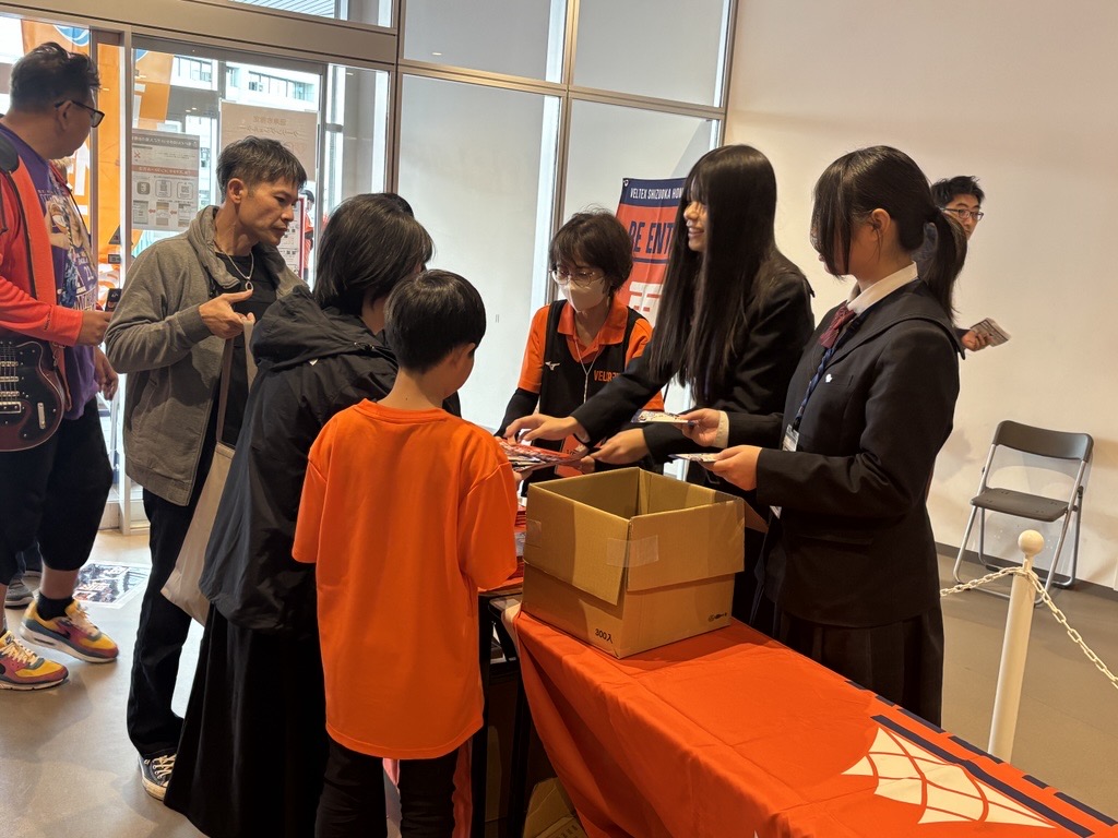 生徒たちは、来場者の方々を最初にお迎えする入場受付や、初めて会場に来られた方へのステッカープレゼントを担当しました。また、試合中は選手が安全にプレイできるよう汗や水滴を拭き取るモッパーを務め、イベントでの景品配付、試合終了後の片付けに至るまで、多岐にわたる運営業務に貢献しました。