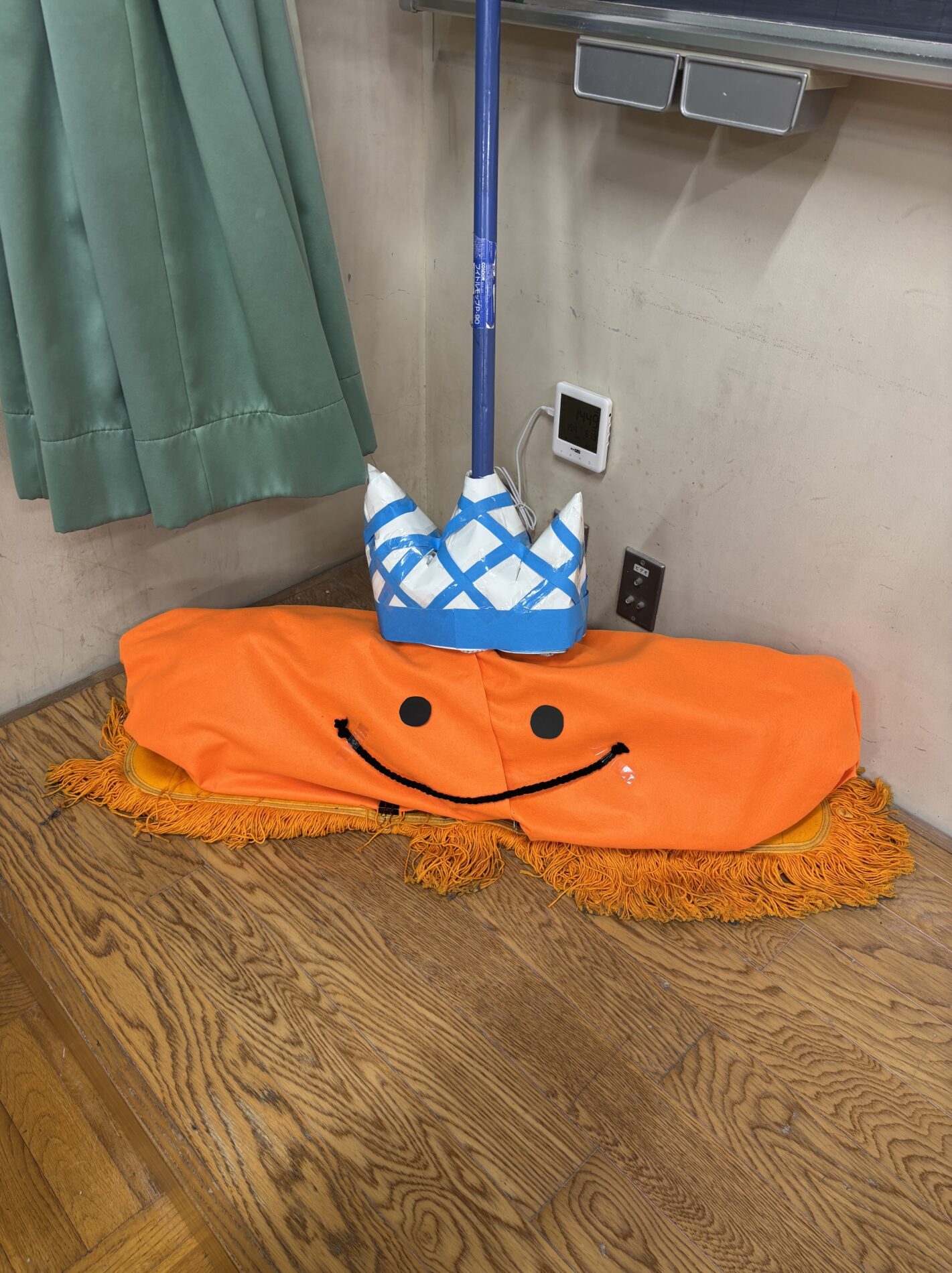 このベルティモップは、販売用ではなく、ホームゲームの休憩時間などにコートで使用することを目的として、本校生徒が実際に制作したサンプルです。お客様に試合の休憩時間も楽しく過ごしていただけるよう、エンターテイメント性の高いコートづくりに貢献したいという生徒のアイデアが形になりました。