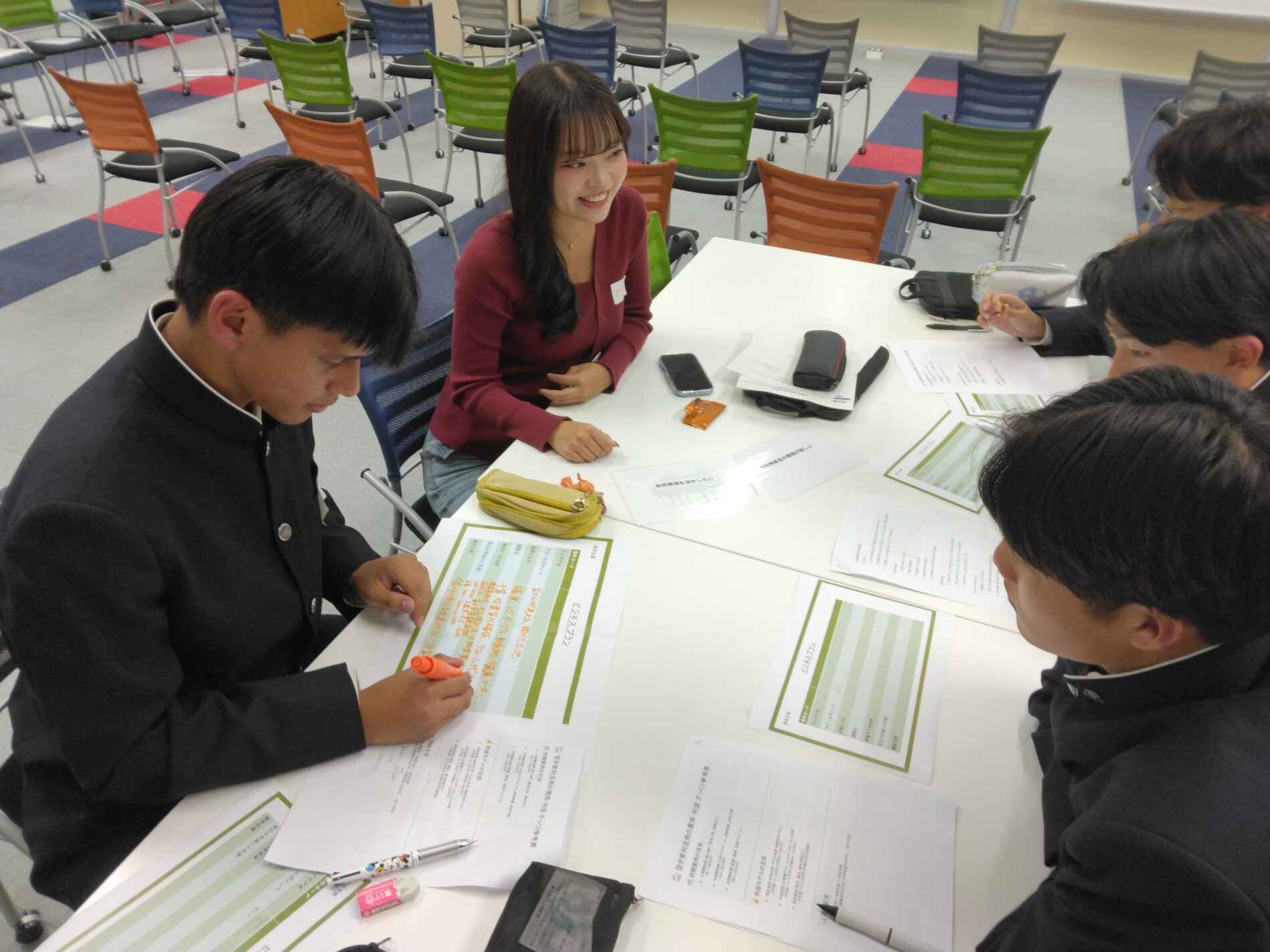 当日は、大学生5名、本校生徒14名が参加し、空き家をテーマにした学びを深めました。まず大学生が作成した「空き家対策に関する動画」を視聴し、意見・感想を共有しました。続いて、空き家の活用方法について、地域の実情を踏まえながらビジネスプランの作成に取り組みました。参加生徒は、「どのようなリノベーションが地域にとって有益か」「収支のバランスは取れるか」といった点を踏まえ、大学生のサポートを受けながら現実的で魅力ある提案をまとめ、最後にグループごとに発表を行いました。