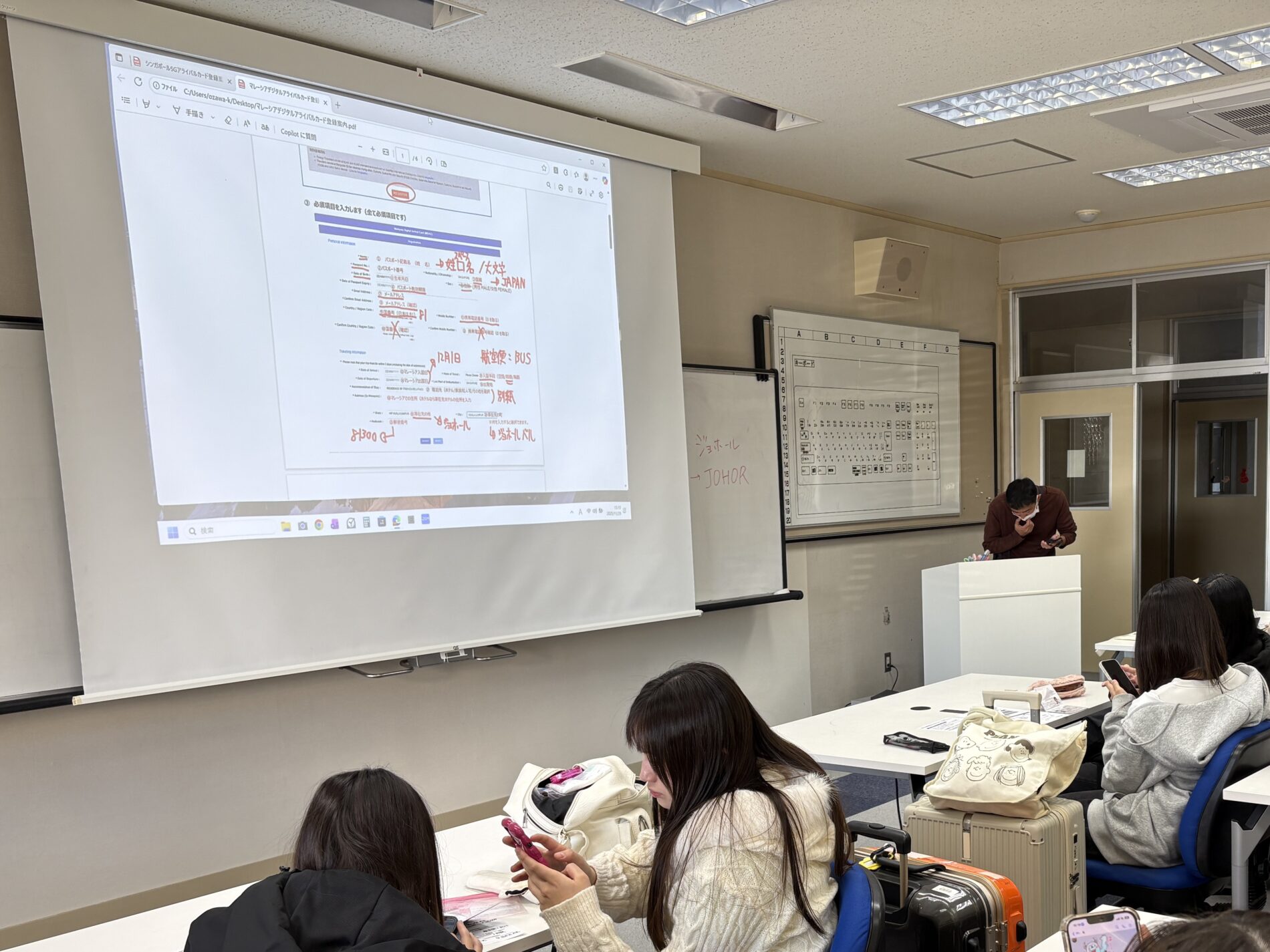 学校で集合した生徒たちは、アライバルカードの登録やパスポートの確認など、出国前の重要な準備をテキパキと行いました 。教員の指導のもと、グループで協力しながら確認作業を進め、海外へ向かう意識を高めました