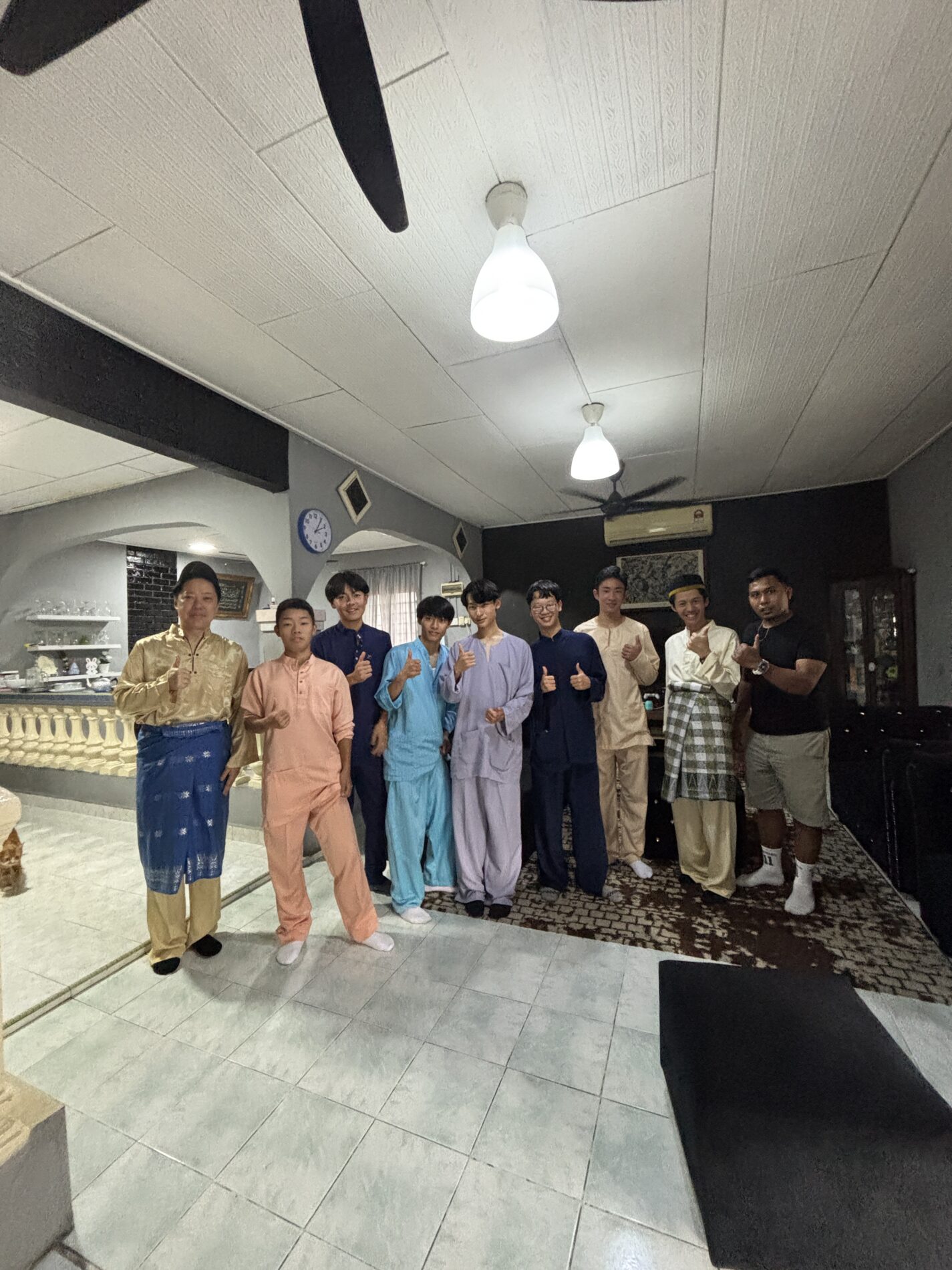 村長の歓迎挨拶と本校生徒代表の挨拶、お土産の交換を済ませた後、生徒たちは班ごとに現地の家庭を訪問しました。これが研修の目玉の一つであるホームステイ体験です。生徒たちは民族衣装に着替え、家庭料理の昼食をいただきました。食事は素手で食べるという現地の習慣を学び、右手のみを使うというマナーを実践するなど、生活に根ざした異文化を深く体験しました。昼食のメニュー例としてマレー風チキンココナッツカレーや牛肉の甘辛煮などが提供され、文字通り現地の味を楽しみました 。この貴重な経験は、多様性に対する理解を深める大きな学びとなりました。