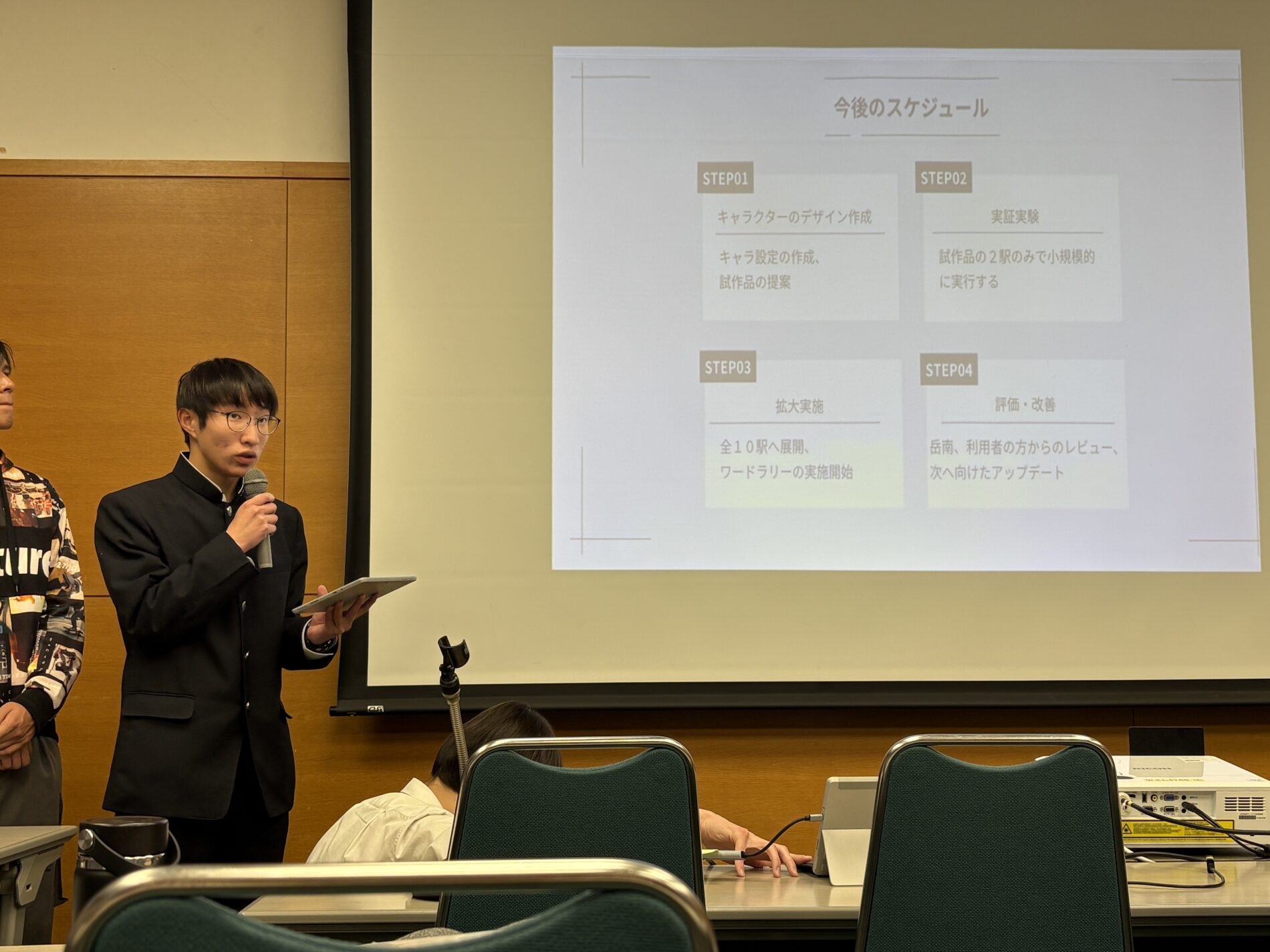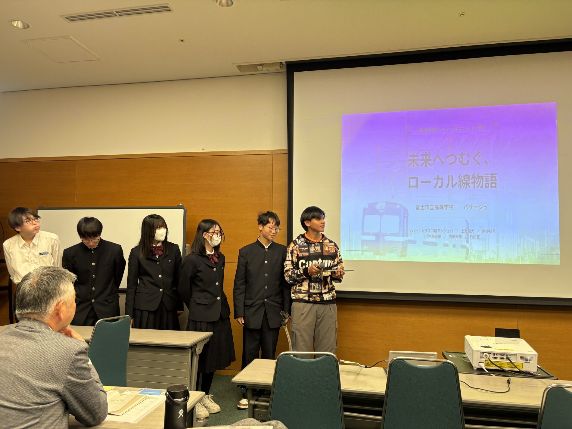 探究成果発表会では、市役所プランのチームが岳南電車を盛り上げる企画を発表しました。自分たちで考えた駅の擬人化イメージなど3つの提案を発表しました。サポーターの方からも「先行事例をしっかりと調べた上で、自分たちなりの企画を考えている」とお褒めの言葉をいただきました。