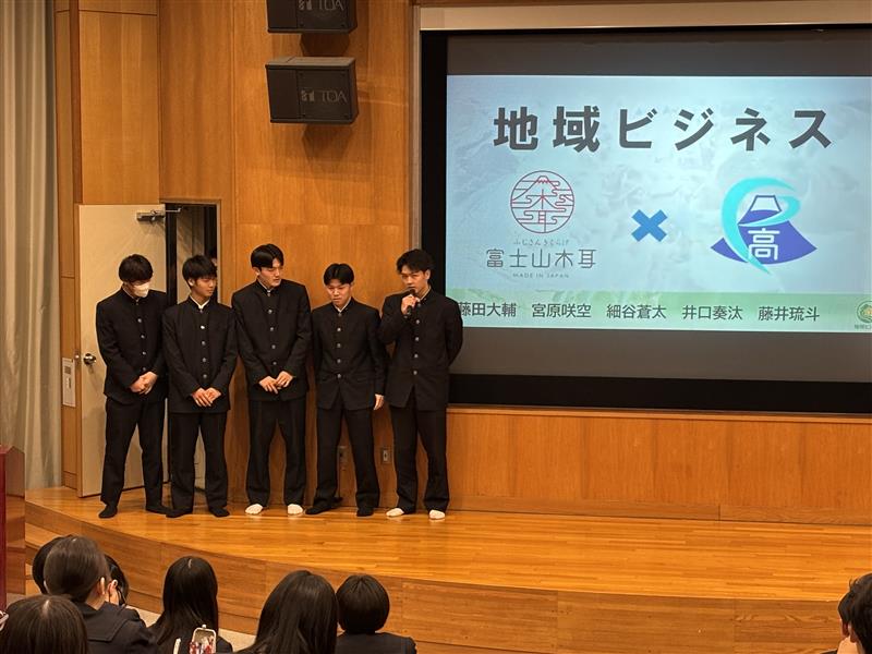 地元の「富士山きくらげファーム」様と連携し、新たな価値を生み出すイノベーションに挑みました。 このグループでは、相手に想いを伝えるための「プレゼンテーション能力(PowerPoint技術)」も重点的に強化。説得力のある提案を行い、実際に木耳(きくらげ)を使った商品を開発し、販売会まで実施しました。ビジネスの現場で通用する実践力を磨きました。