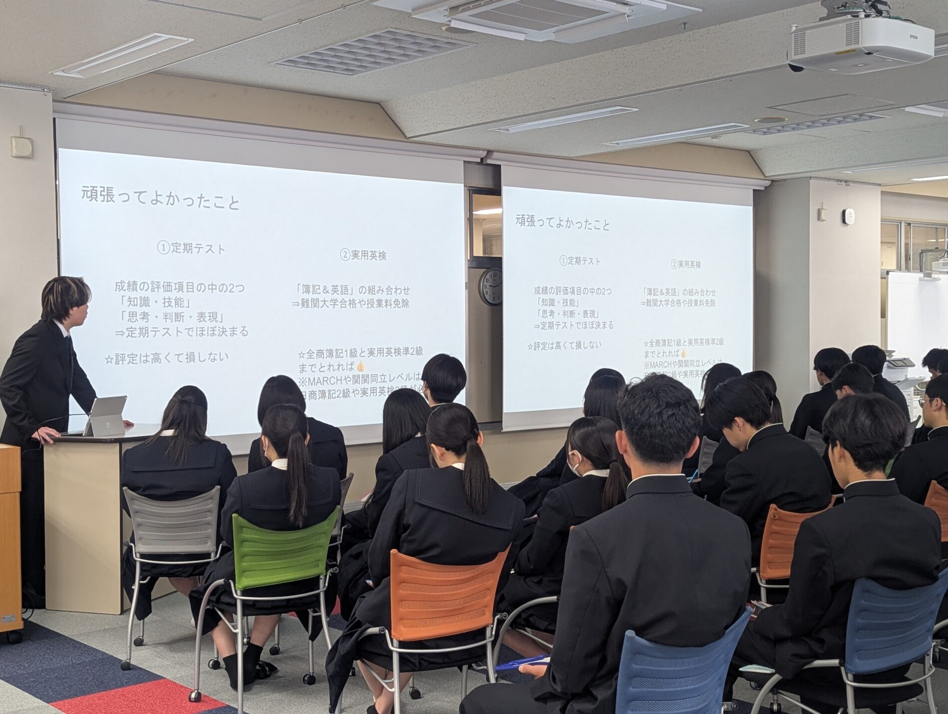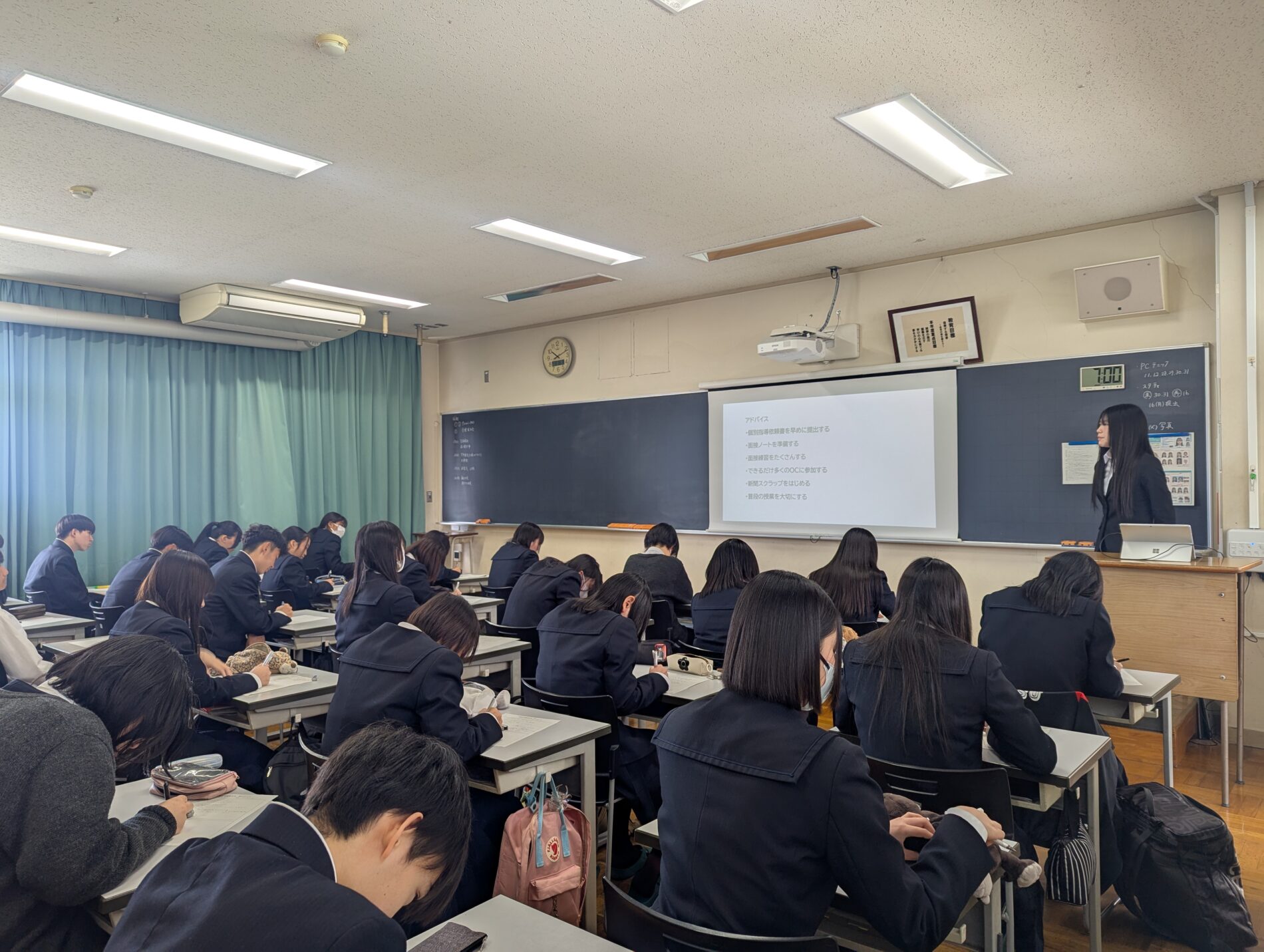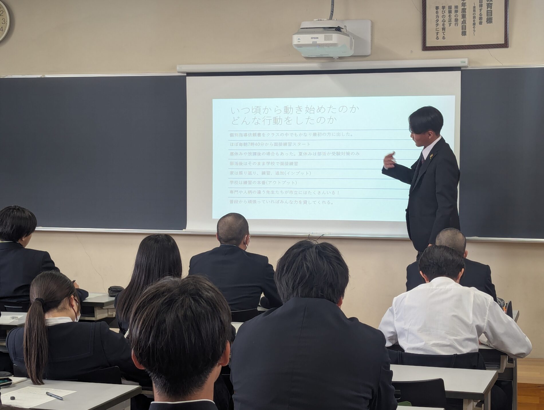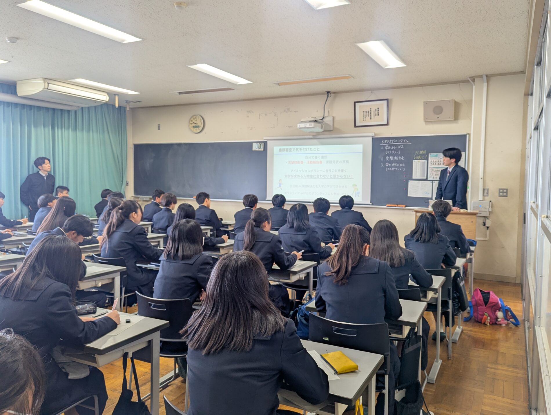 3月16日(月)、2日に卒業したばかりの先輩約20名が、1年生と2年生を対象に、それぞれ受験や就職で頑張ったことや辛かったこと、アドバイスなどを話しました。先輩たちの成功のコツやリアルな失敗談などに耳を傾け、熱心にメモを取っていました。