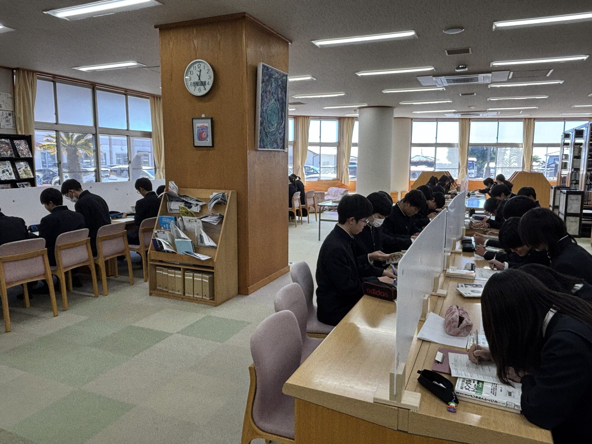 今回は、「~自分の興味を学問につなげる日~」というテーマで、学校の図書室を利用した進路学習を行いました。