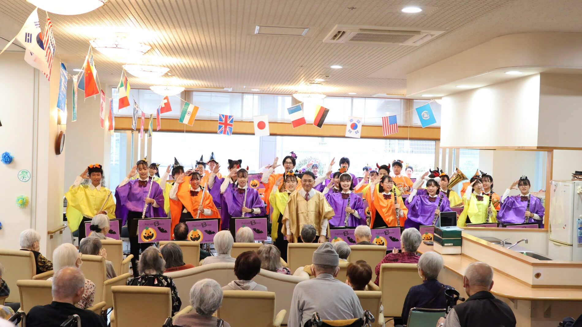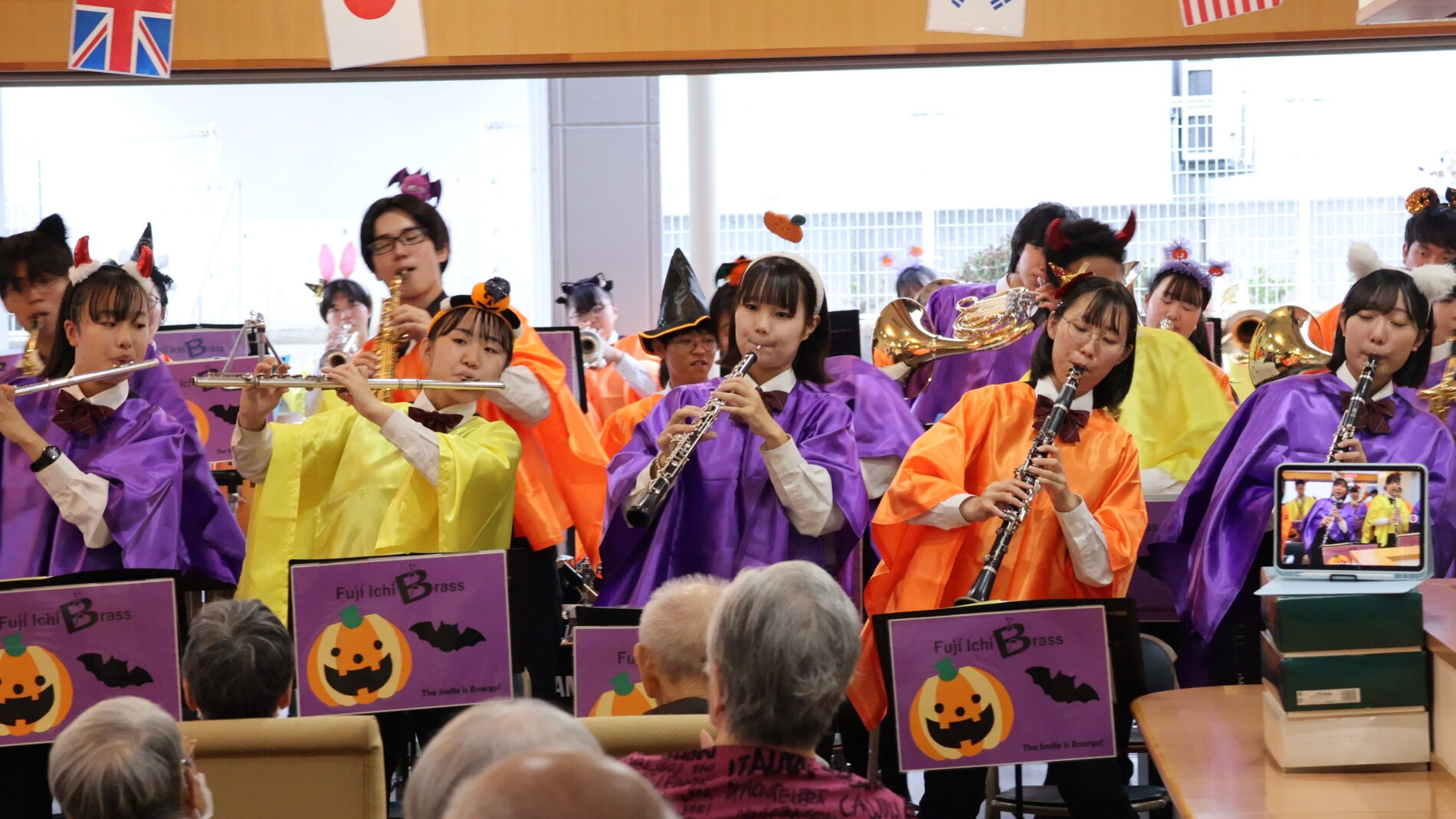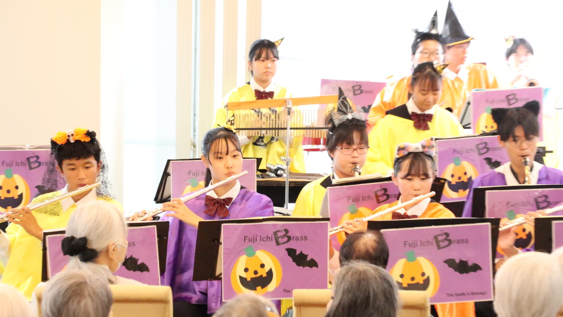 令和7年10月18日(土)に富士市内の特別養護老人ホーム「ヴィラージュ富士」を訪問し、慰問演奏を行いました。昨年に続いて2度目の訪問となり、前回の演奏を覚えていてくださった利用者の方々との再会に、部員たちは喜びを感じながら演奏に臨みました。