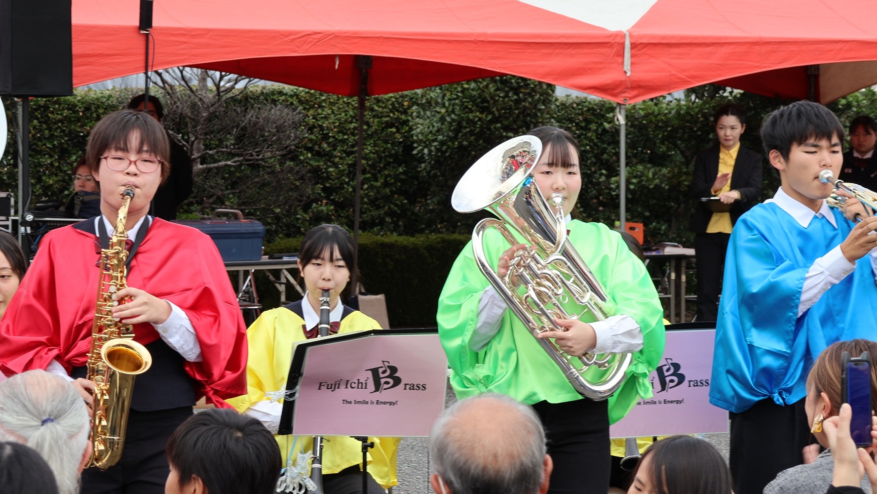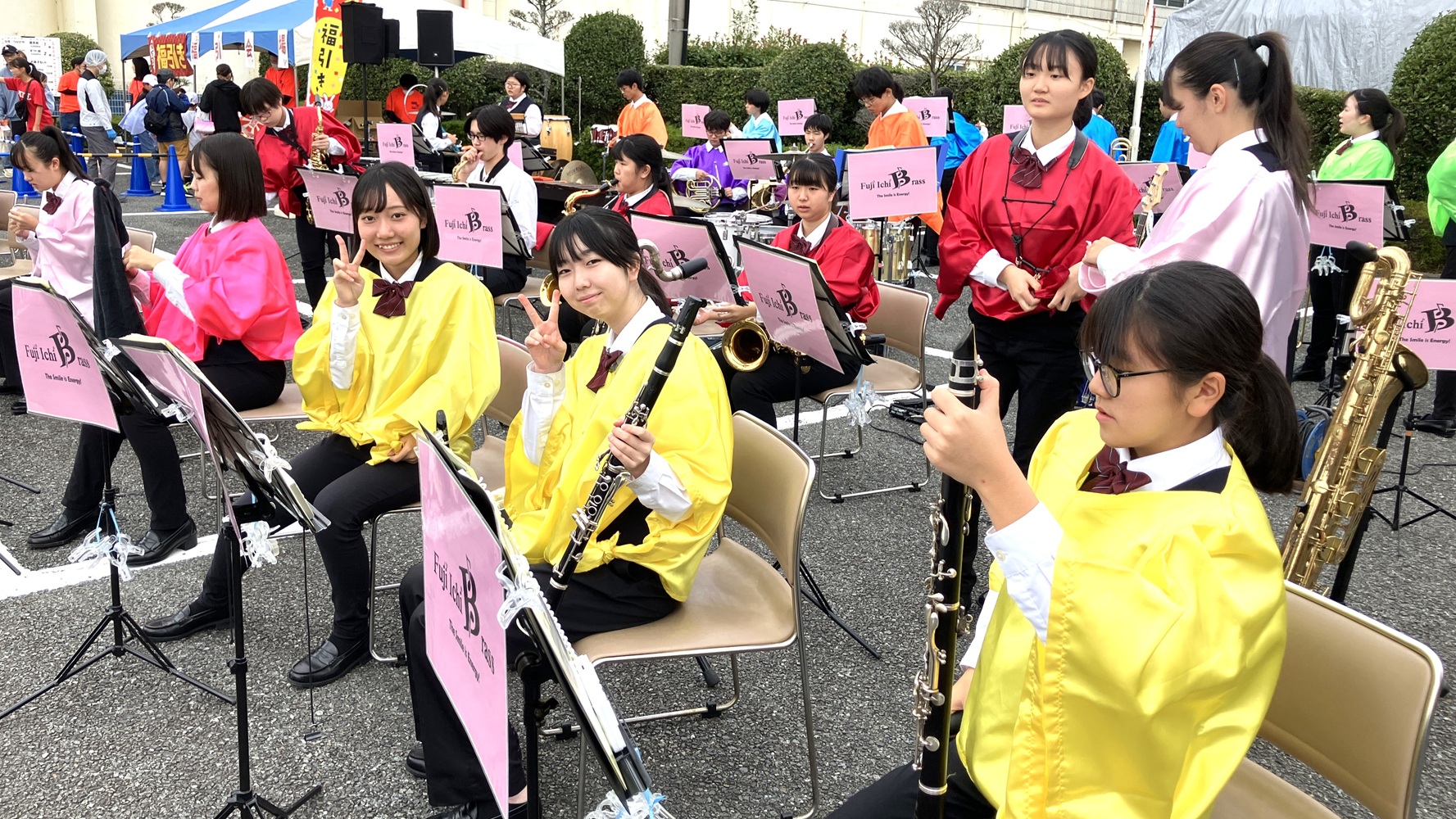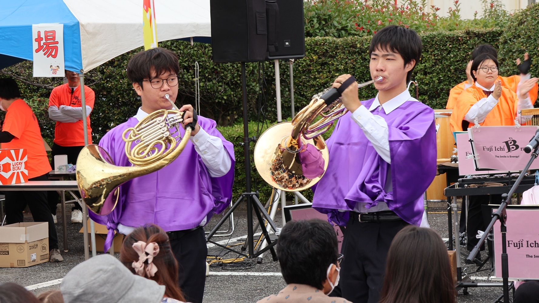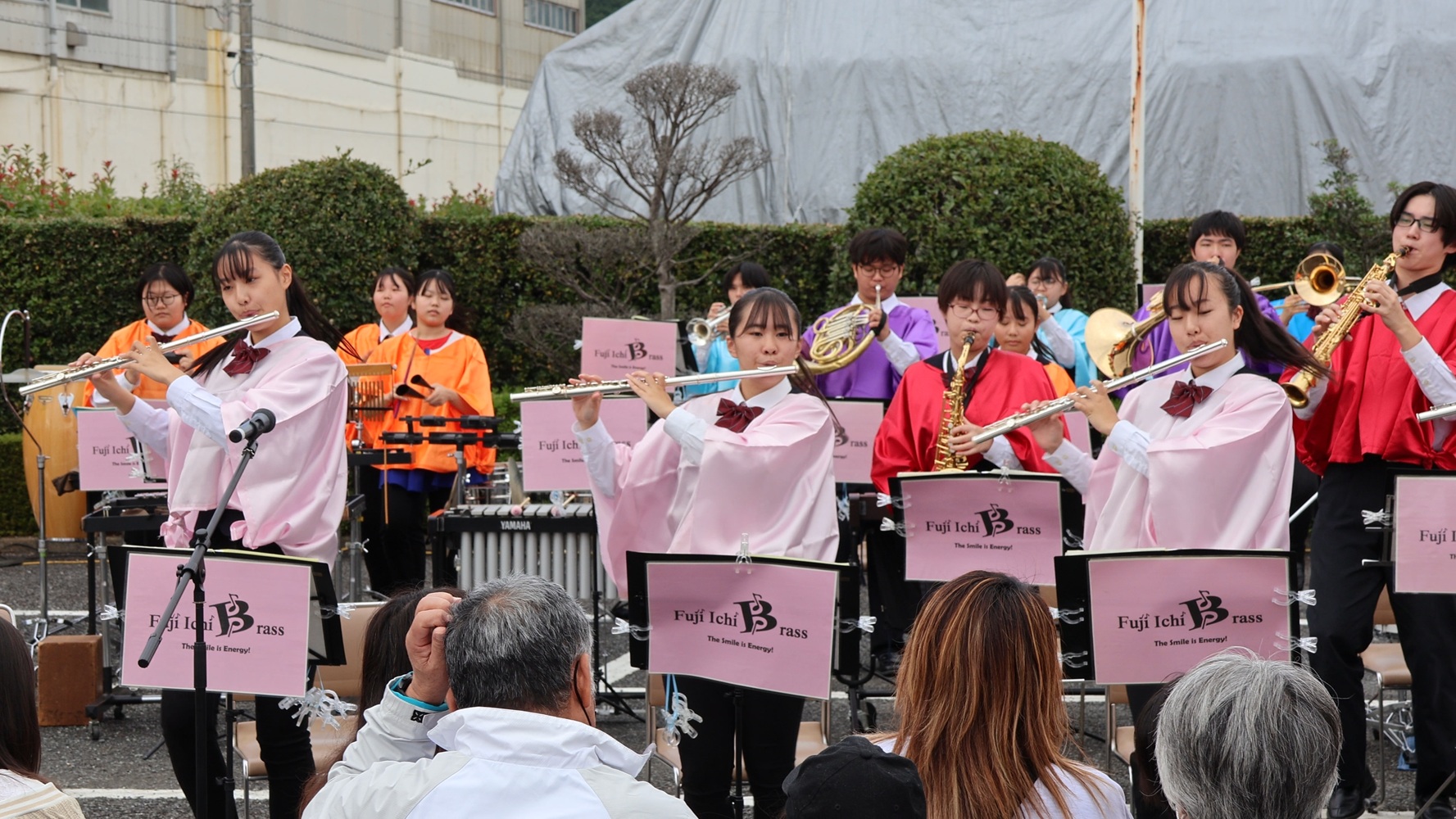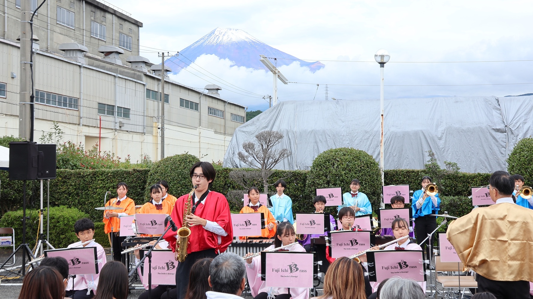 興亜祭は、富士市比奈にある興亜工業株式会社の敷地を会場として開催されており、本校からも非常に近い場所に位置しています。来場者の多くは、興亜工業や本校の近隣にお住まいの方々で、地域に根ざした温かい雰囲気の中で行われるお祭りです。今年は1,300人を超える方々が来場し、吹奏楽部のステージにも多くの方々が足を止めてくださり、演奏に耳を傾けてくださいました。