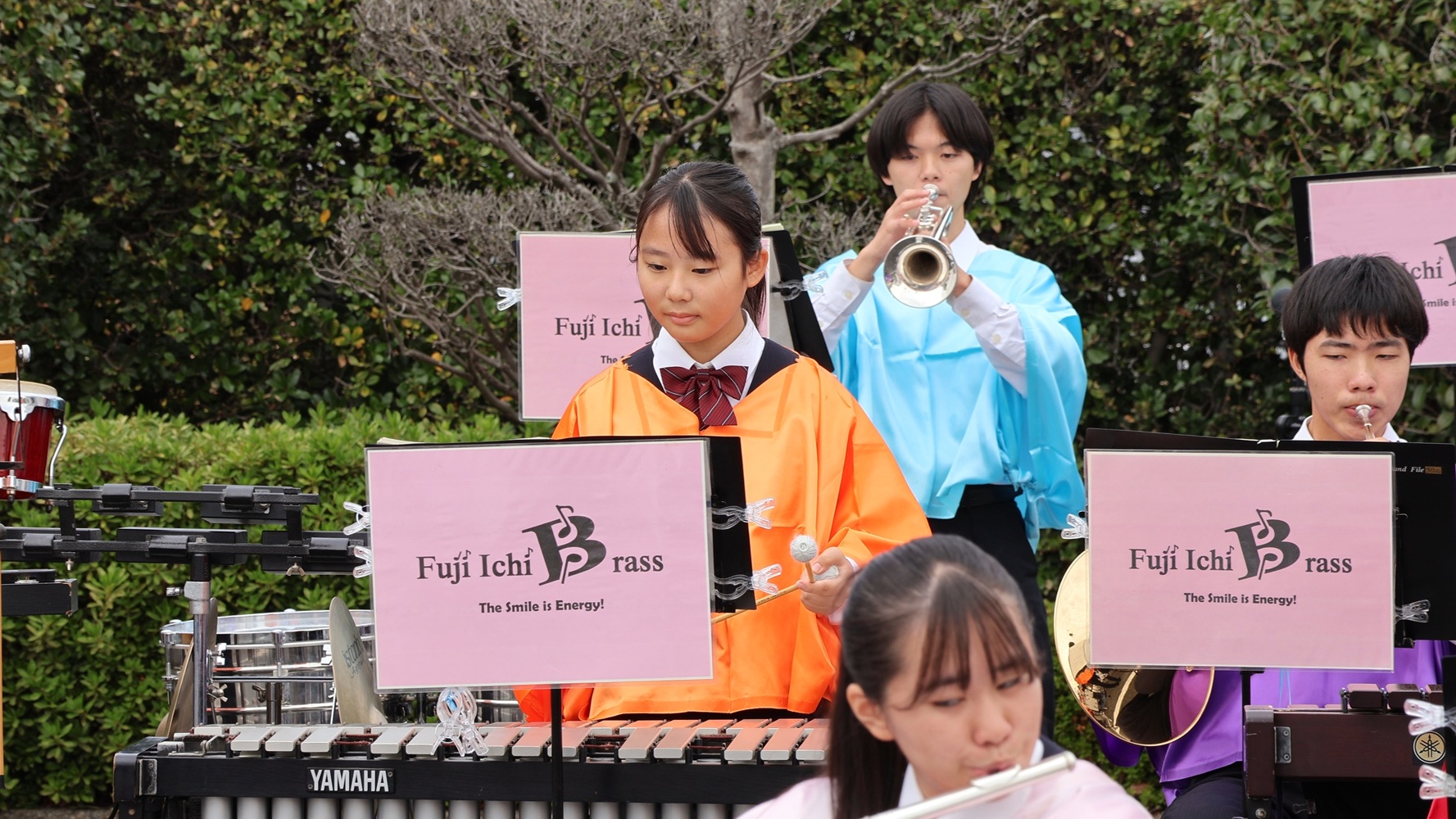 演奏では、地域の皆様に楽しんでいただけるよう、親しみやすくバラエティに富んだ選曲を行いました。ステージの幕開けには、定番の「テキーラ」を演奏し、会場の雰囲気を一気に盛り上げました。続いて、今回が初披露となる「A Disneyland Celebration」では、ディズニーの世界観を華やかに表現し、子どもから大人まで幅広い世代に楽しんでいただきました。「演歌メドレー」では日本の名曲を繋ぎ、懐かしさと親しみを感じていただける構成としました。「マンボメドレー」ではリズミカルな演奏で会場をさらに盛り上げ、「フジサンバ」では地元・富士市への感謝の気持ちを込めて演奏しました。アンコールでは「小さな世界」を披露し、会場全体が一体となる温かい雰囲気に包まれました。