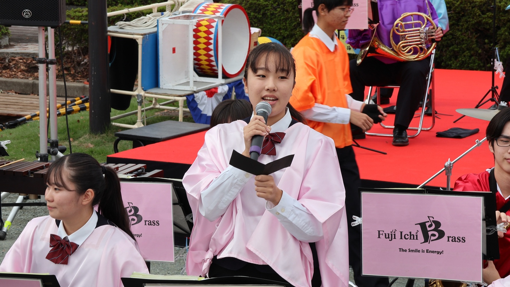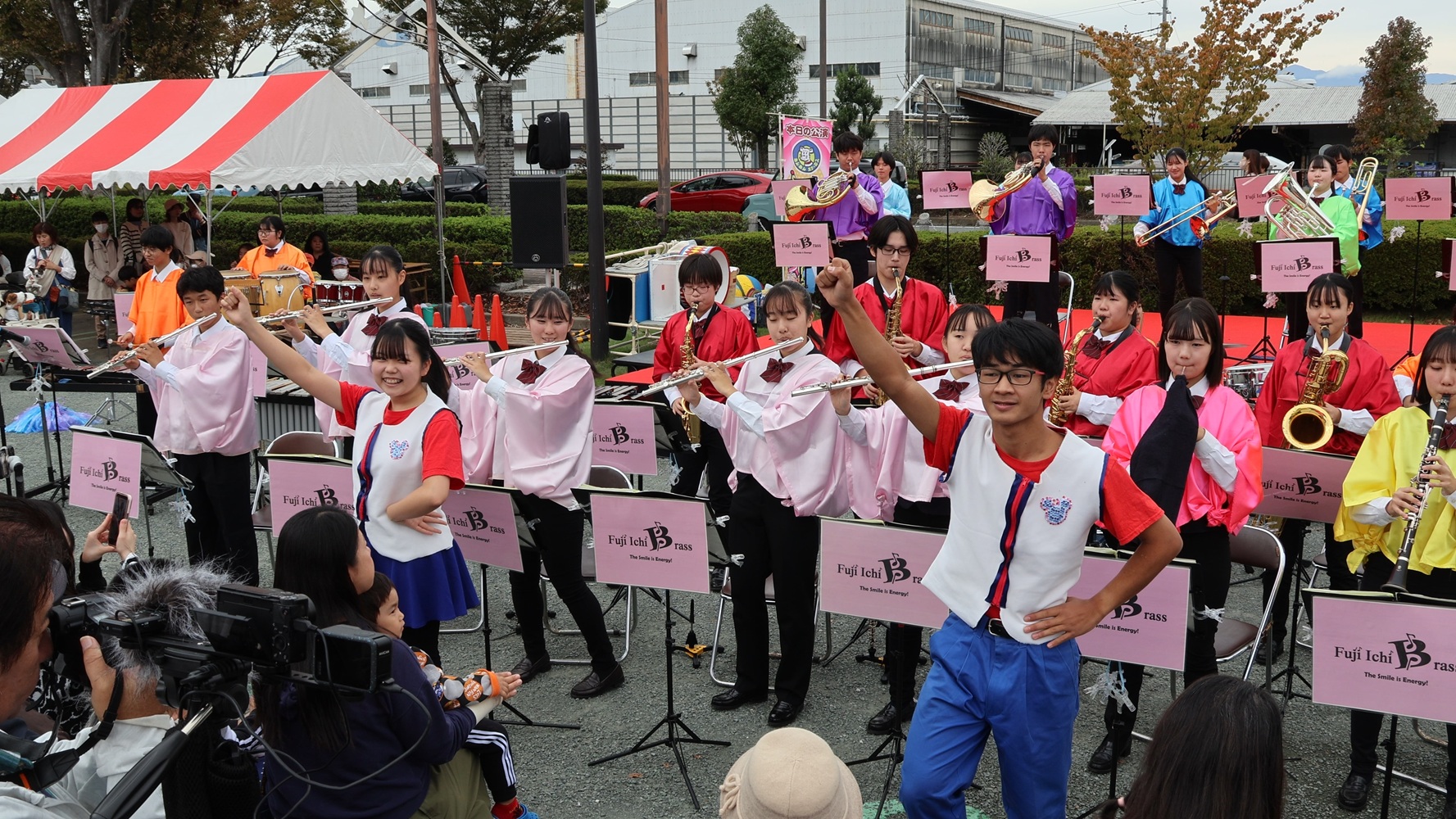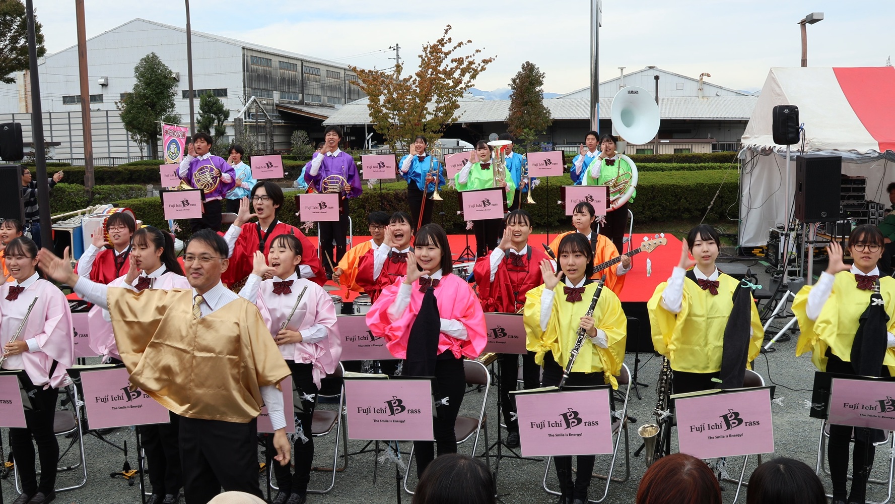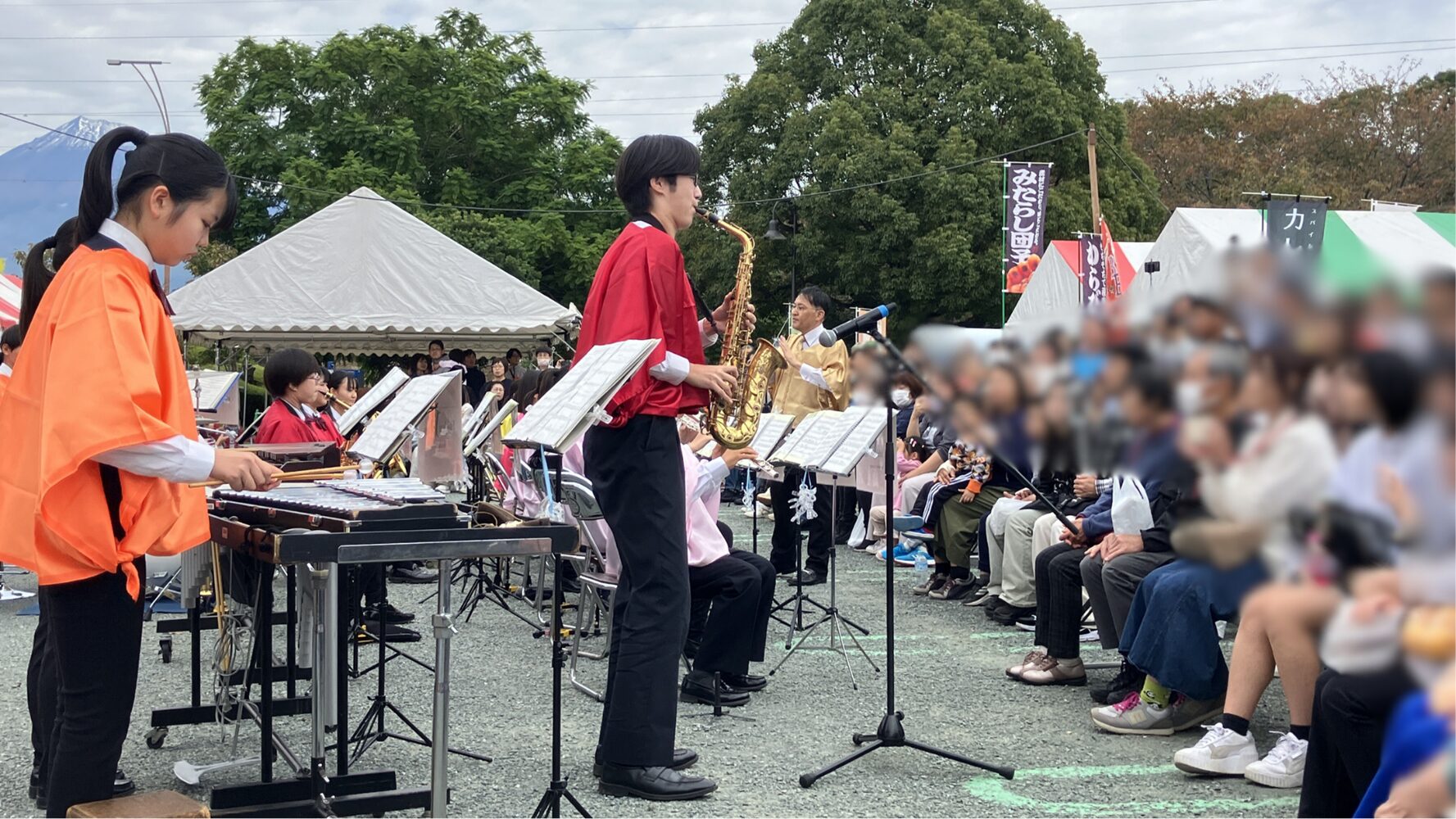 令和7年11月2日(土)に富士市中央公園で開催された「第38回富士市産業まつり商工フェア」において、本校吹奏楽部がステージ演奏を行いました。