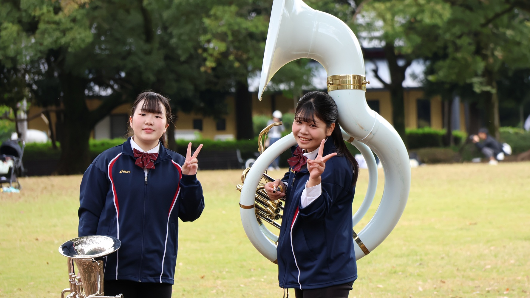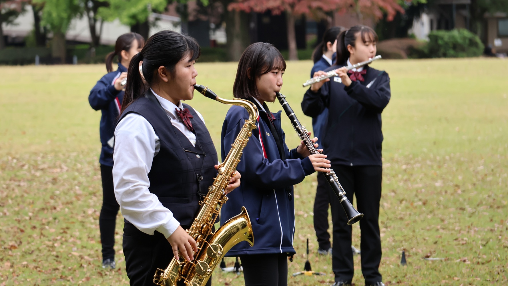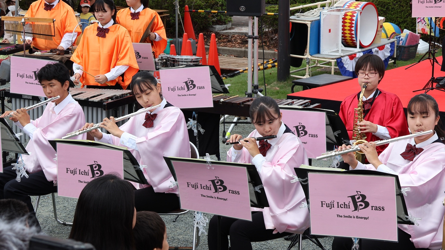 本校吹奏楽部は、毎年この商工フェアに出演する機会をいただいており、今年も秋晴れの爽やかな空の下で演奏を行いました。演奏した曲目は、「テキーラ」「A Disneyland Celebration」「ジャンボリミッキー」「マンボメドレー」「演歌メドレー」「フジサンバ」「小さな世界」の7曲です。ジャンルの幅を広げることで、子どもから大人まで幅広い世代の方々に楽しんでいただけるよう工夫しました。演奏中には手拍子や拍手をいただく場面もあり、音楽を通して地域の皆様と心を通わせることができたと感じています。