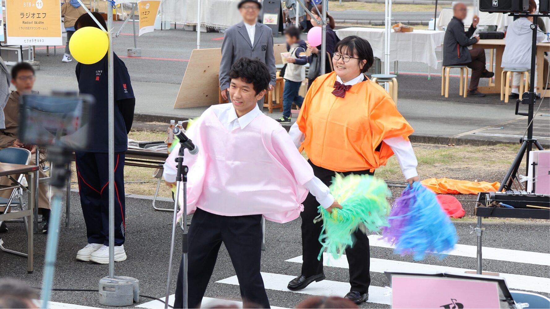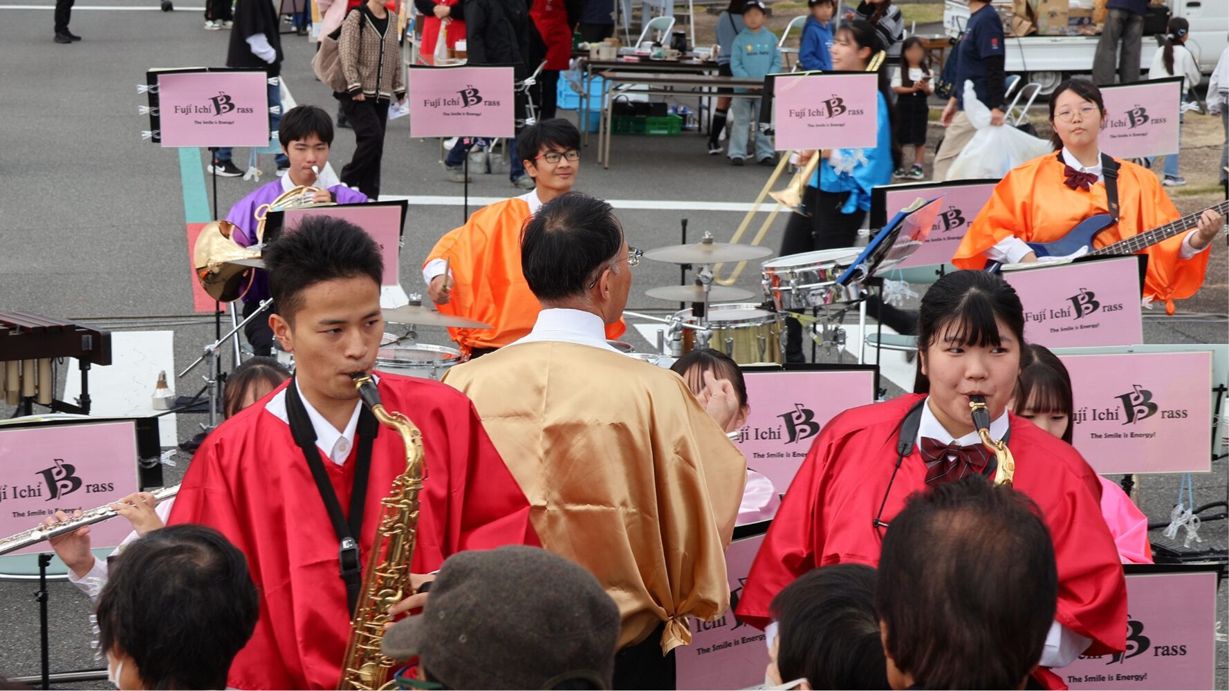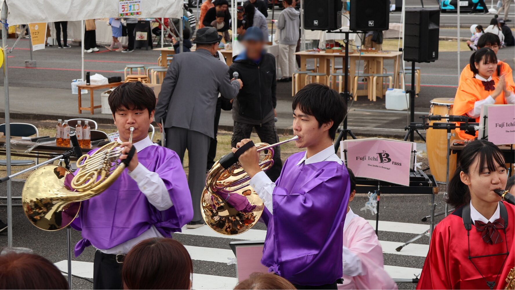 本校吹奏楽部は、前身の「Do Lightフェスタ」から継続して出演しており、今年もイベントの大トリを務めました。秋晴れの空の下、会場に集まった皆様に音楽で笑顔を届けることを目標に、心を込めて演奏しました。披露した曲目は、「テキーラ」「A Disneyland Celebration」「エビカニクス」「演歌メドレー」「マンボメドレー」「フジサンバ」「小さな世界」の7曲です。子どもから大人まで楽しめる選曲を意識し、会場全体が手拍子や笑顔で包まれる時間となりました。