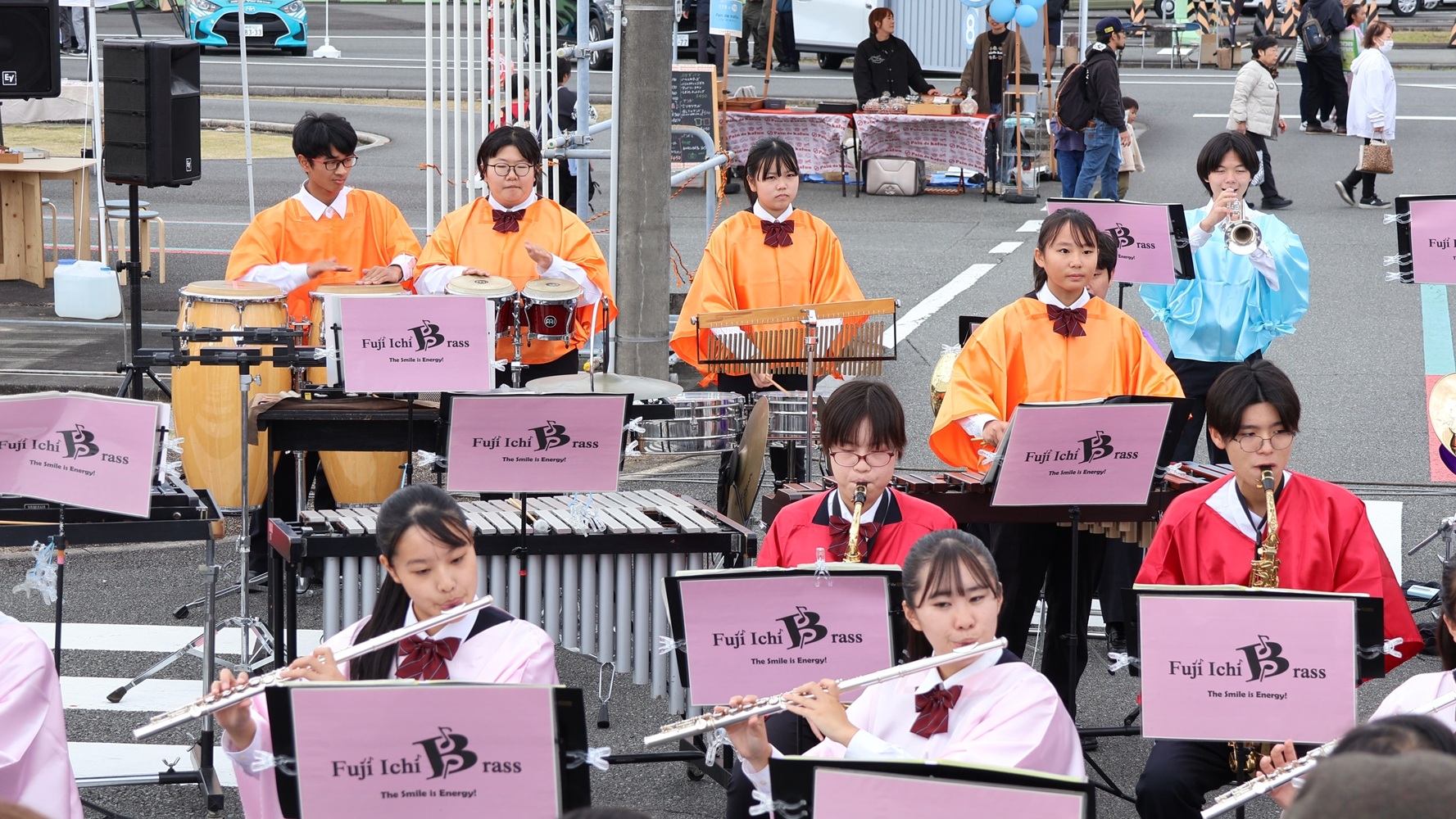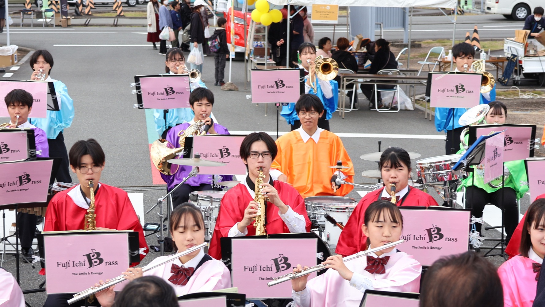 本校吹奏楽部は、前身の「Do Lightフェスタ」から継続して出演しており、今年もイベントの大トリを務めました。秋晴れの空の下、会場に集まった皆様に音楽で笑顔を届けることを目標に、心を込めて演奏しました。披露した曲目は、「テキーラ」「A Disneyland Celebration」「エビカニクス」「演歌メドレー」「マンボメドレー」「フジサンバ」「小さな世界」の7曲です。子どもから大人まで楽しめる選曲を意識し、会場全体が手拍子や笑顔で包まれる時間となりました。