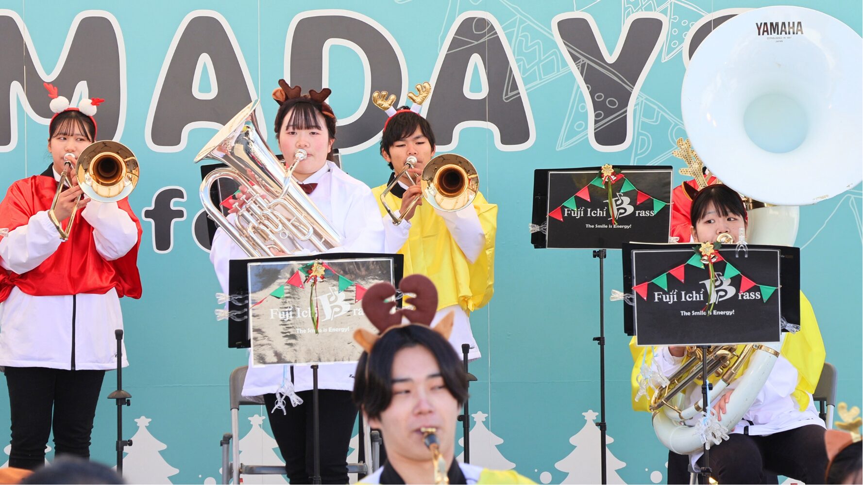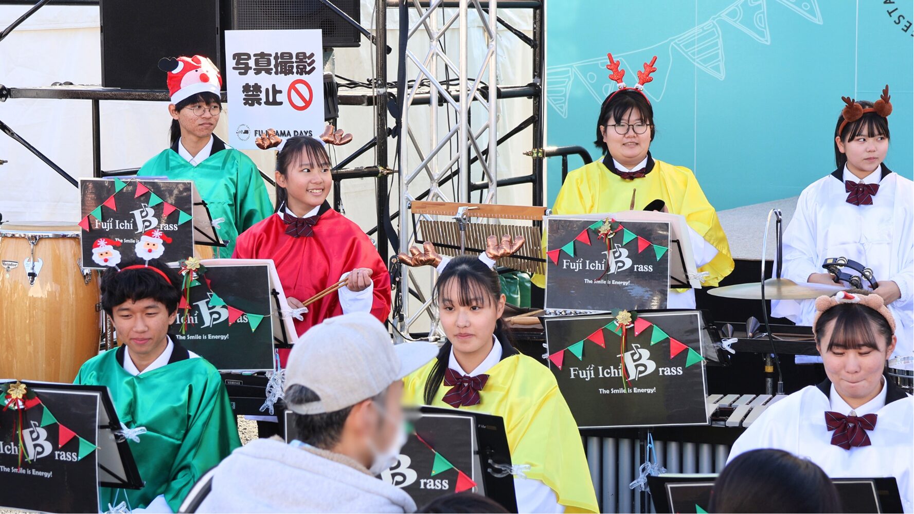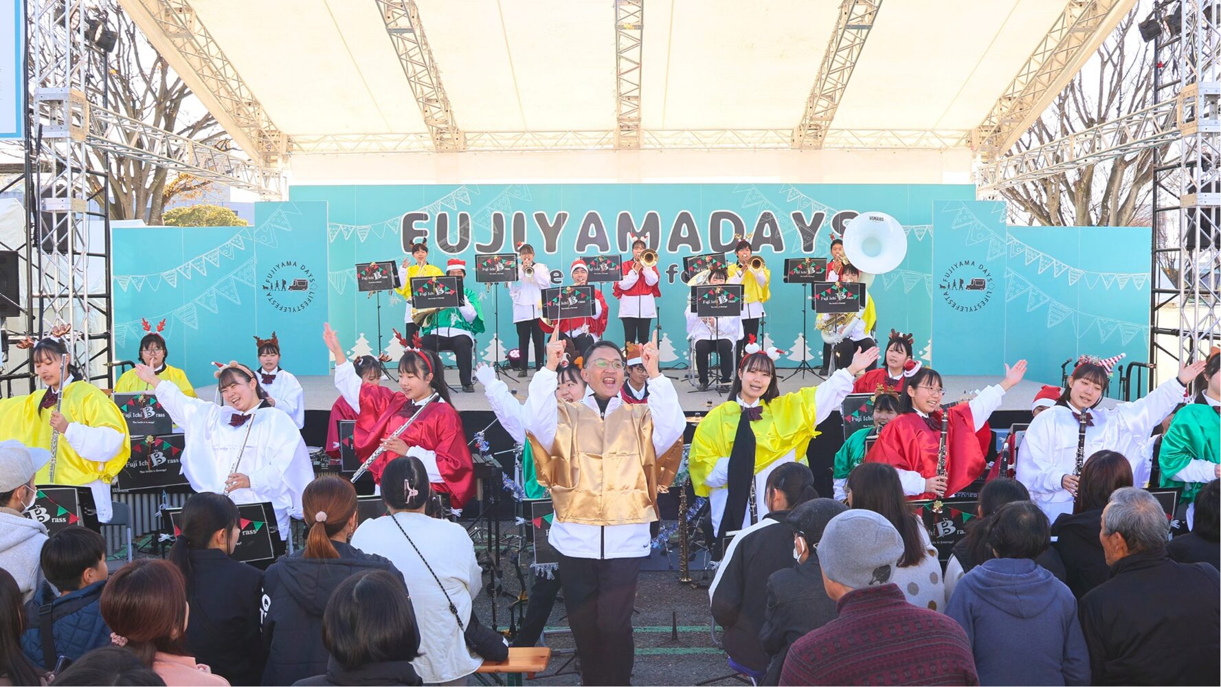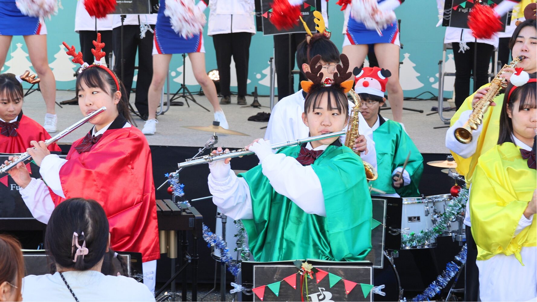 令和7年12月13日(土)富士市中央公園で開催された「FUJIYAMA DAYS LIFE STYLE FESTA」に本校吹奏楽部が出演しました。FUJIYAMA DAYSは、世界各地のグルメを楽しめるフードトラックや雑貨・ペット関連のマルシェ、イルミネーションなどが集う、富士市の冬を彩る人気イベントです。昼間の賑わいから夜のライトアップまで、幅広い世代が楽しめるこの催しに、私たちは毎年演奏の機会をいただいています。