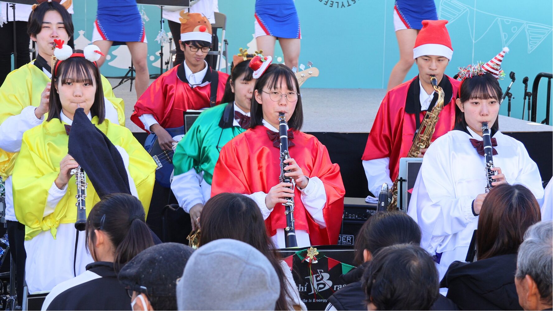 演奏を彩ったのは音楽だけではありません。本校総合カルチャー部が製作してくれたクリスマスらしい譜面隠しの装飾がステージを華やかに演出し、観客の皆様からも「とても素敵!」との声をいただきました。また、この日は新しく製作したウインドブレーカーを着用し、部員全員が揃った姿で一日を過ごしました。統一感のある装いは、私たちのチームワークを象徴するものとなり、演奏にも良い影響を与えたと感じています。