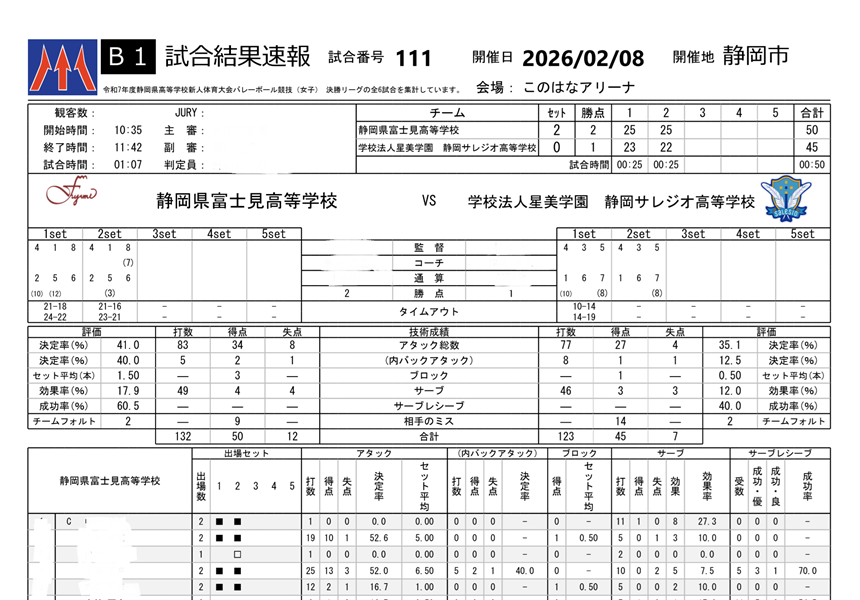 大会の2日目(2/1)・3日目(2/8)は、ベスト4チームが行うリーグ戦の技術統計を行いました。日本バレーボール協会が公認する判定員規定を大会前に学び、JVIMSというソフトを使いながら大会の当日にコートサイドで集計をしました。(4枚目の画像が集計した内容の一部です)サーブレシーブの成功率といった、いつもとは違う視点で試合を注意深く見ることで、自分たちの意識を変えていく経験ができました。